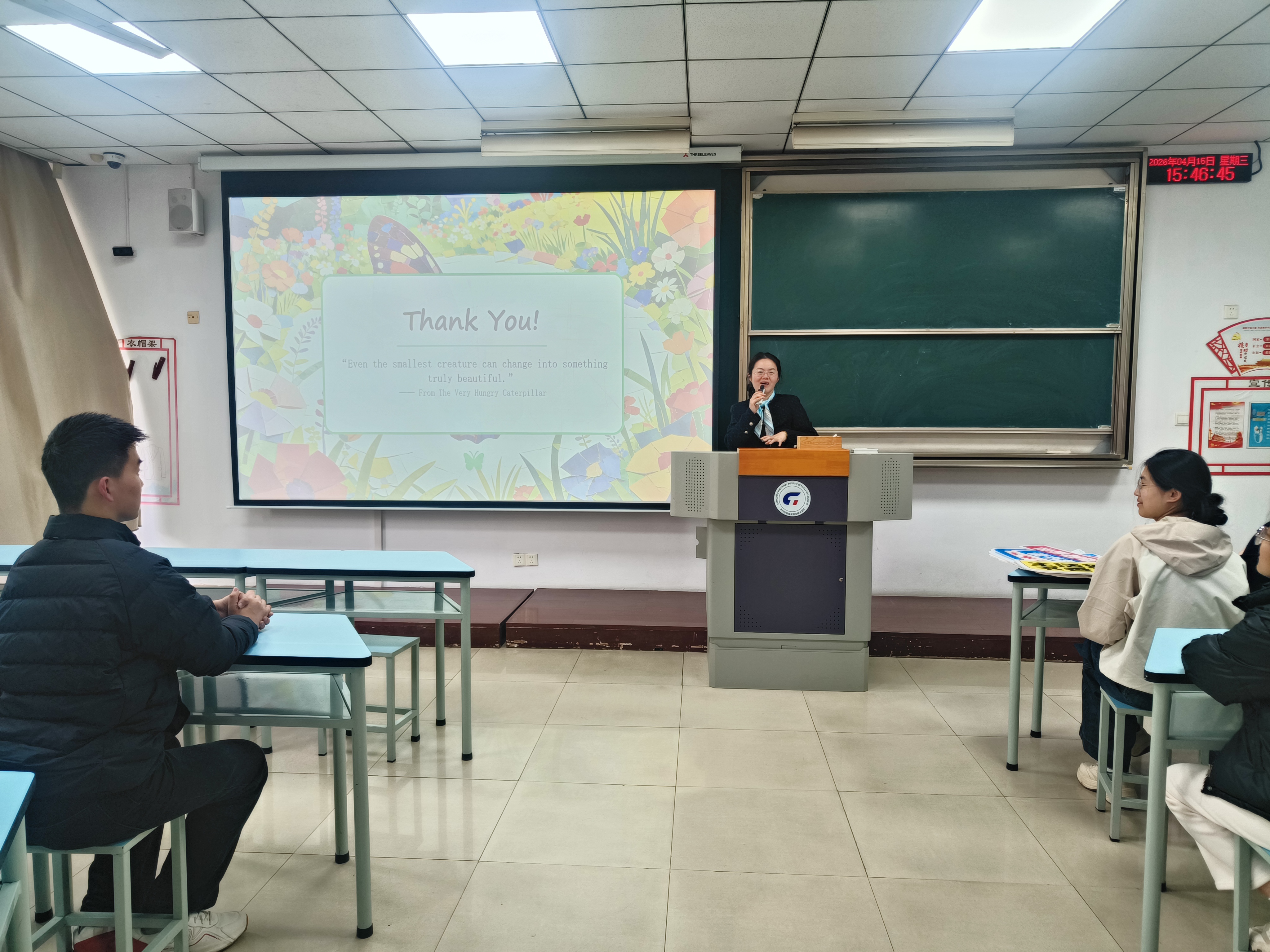 核心环节中,绘本短片生动呈现毛毛虫从汲取养分、积蓄力量到破茧成蝶的成长历程。观看结束后,同学们自告奋勇依次朗读绘本全文,并围绕故事内涵分享感悟,夏宇璇同学“持续积累方能实现蜕变”的心得,引发大家强烈共鸣。倪聆老师结合英语学习实际,分享英语四级备考实用技巧,助力同学们夯实语言基础、提升备考效率。